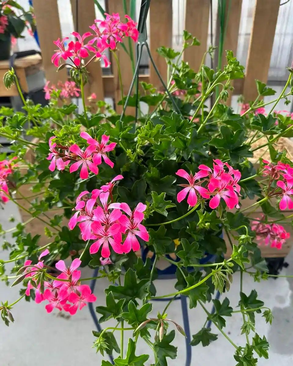 Ivy geraniums are basket icons. The trailing stems carry clusters of red or cherry-pink that hummers absolutely notice. I like them as the structural backbone in mixed baskets with calibrachoa tucked at the edges.