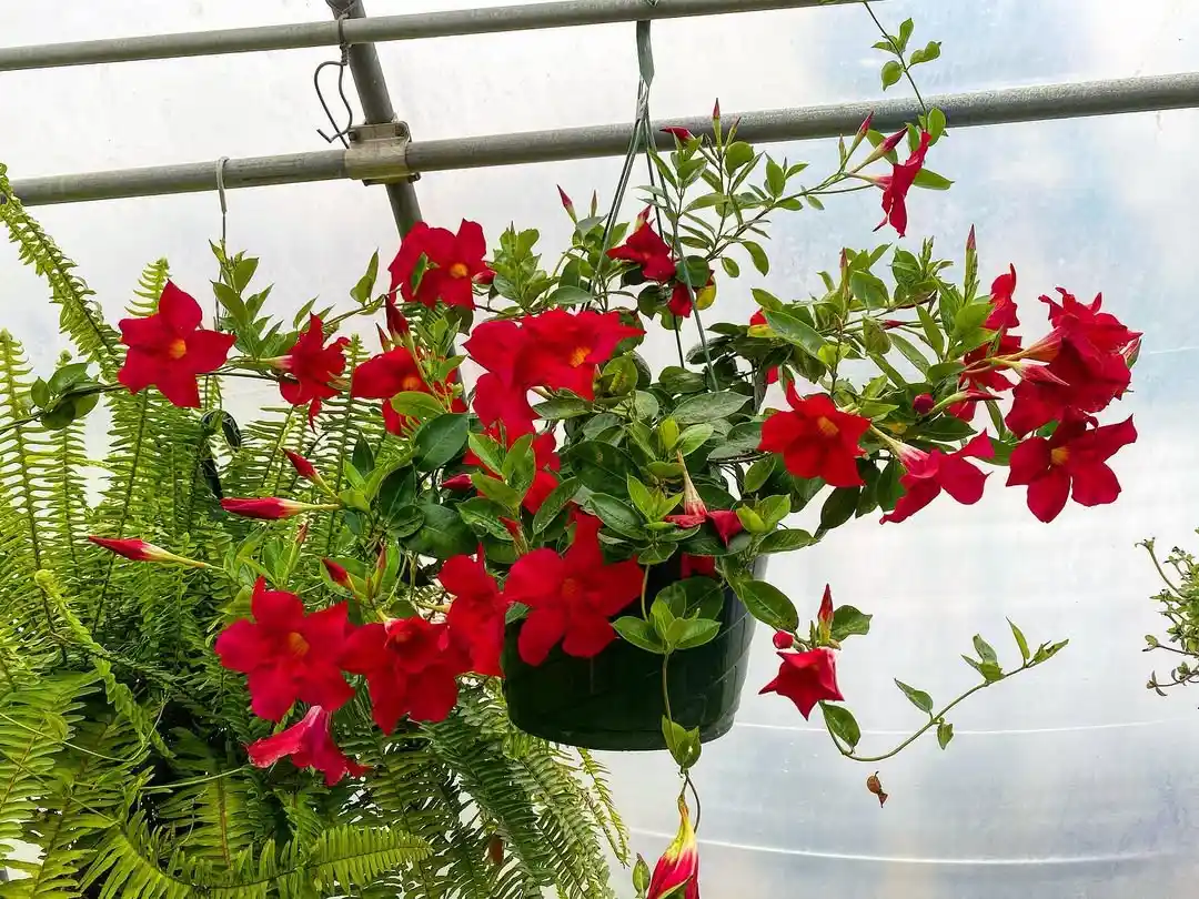 If your vibe is resort patio, this is your star. Big, waxy trumpets in lipstick red or hot pink make a bold nectar target. I run mandevilla solo in a coco-lined 14″ basket with a hoop and let it drape and climb all at once.