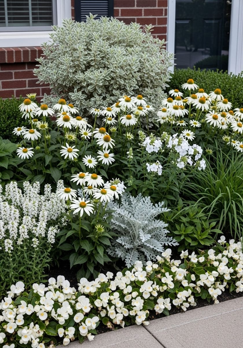 White blooms glow at dusk and read calm against brick or dark siding. Build the mix with white coneflower, shasta daisy, white salvia, phlox, and silver artemisia. Use glossy-leaf shrubs for a crisp backdrop, then edge with white begonias or sweet alyssum so the brightness reaches the sidewalk.