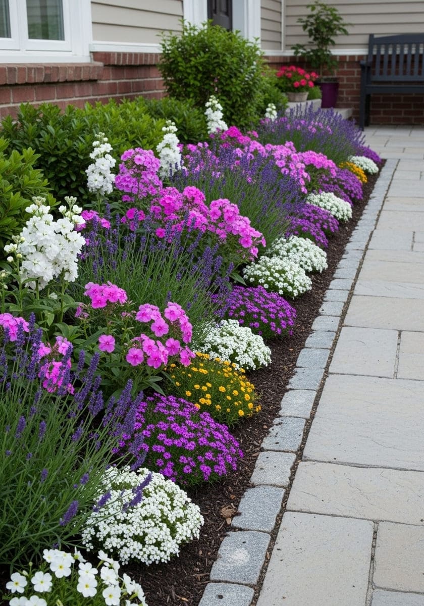 Place scented plants where noses go—along the path. Dwarf lavender, dianthus, sweet alyssum, and garden phlox add scent without high care. It’s an instant upgrade for flowers in front of house.