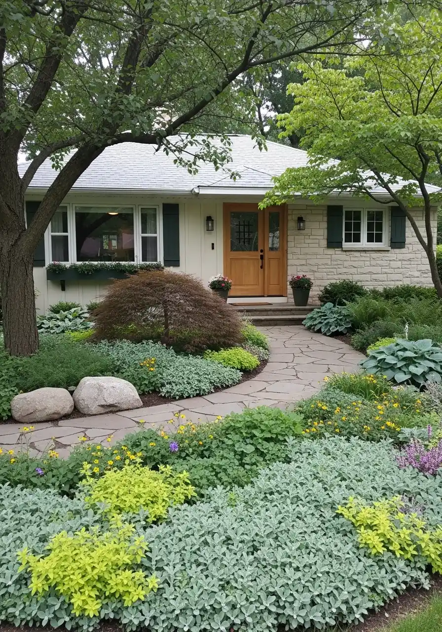 As far as illinois front yard landscaping ideas go, this one is perfect for older homes or shaded lots. I love how the foliage does most of the visual work instead of relying on loud flower color. The silvery plants in front brighten the shade, and the Japanese maple adds that soft red tone that makes the scene feel rich. If I used this idea, I’d pay special attention to plant layers. Tall canopy, medium shrubs, low mounds, and groundcovers. That layering is what makes a shaded yard feel alive instead of dull. To me, this one feels the most soulful.