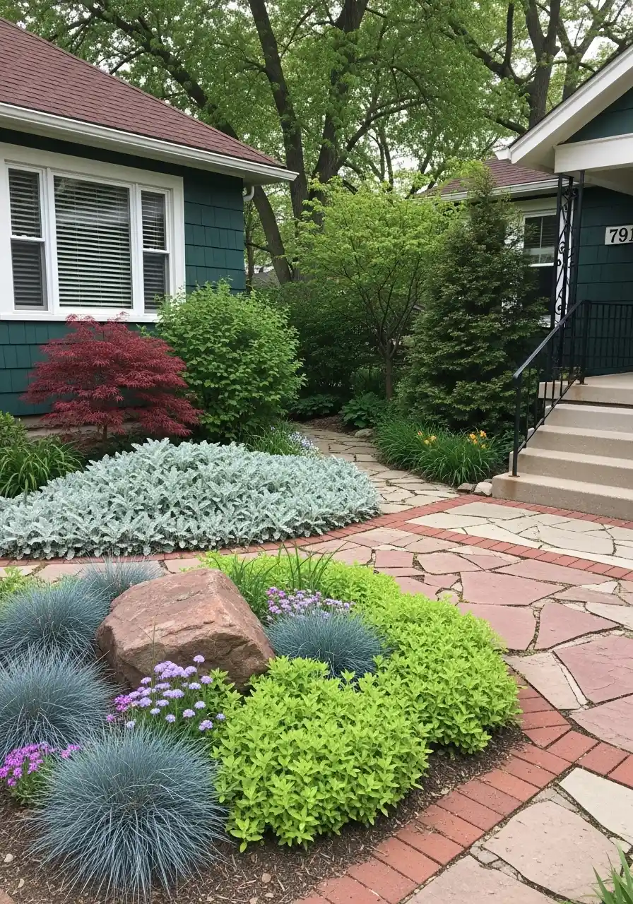 This yard feels personal to me, like somebody really thought about every turn and color instead of just buying a few shrubs and hoping for the best. The flagstone path already has movement, but the thin brick border sharpens it up and keeps the whole thing from drifting into messy. I love that because I think a lot of illinois front yard landscaping ideas fail when they dont have enough structure. This one does. The silver foliage, red Japanese maple, soft green shrubs, and blue grasses all play off each other in a way that feels calm but still rich.