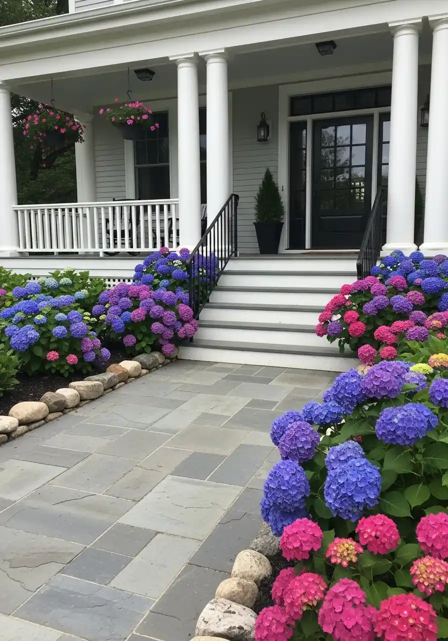 This one is louder than some of the others, but I kind of love that about it. The hydrangeas in blue, purple, and pink feel happy in a really obvious way. It is not shy, and honestly not every yard should be shy. Against the white porch columns and dark front door, the color stands out like crazy. These blooms feel full, soft, and almost fluffy, which keeps the entry from looking stiff even with the formal porch shape.