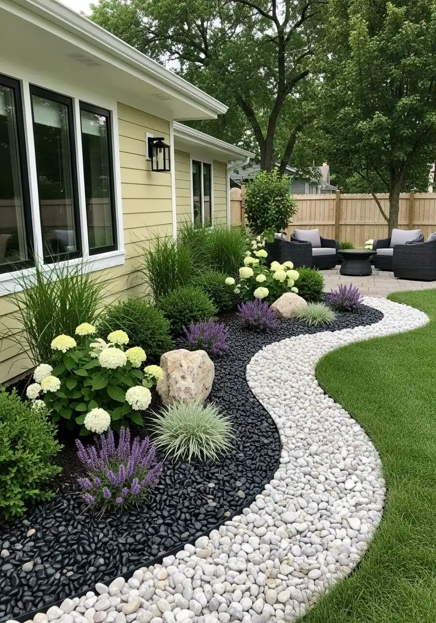 This yard is super clean, and I mean that in a satisfying way. The black stone bed next to the white river rock border creates a bold graphic look. It almost feels modern, but the plants keep it from being too sharp. White hydrangeas, lavender toned flowers, little grasses, and clipped shrubs bring life and softness. I think the color contrast is what makes this design memorable. It turns an ordinary side yard into something that feels styled.