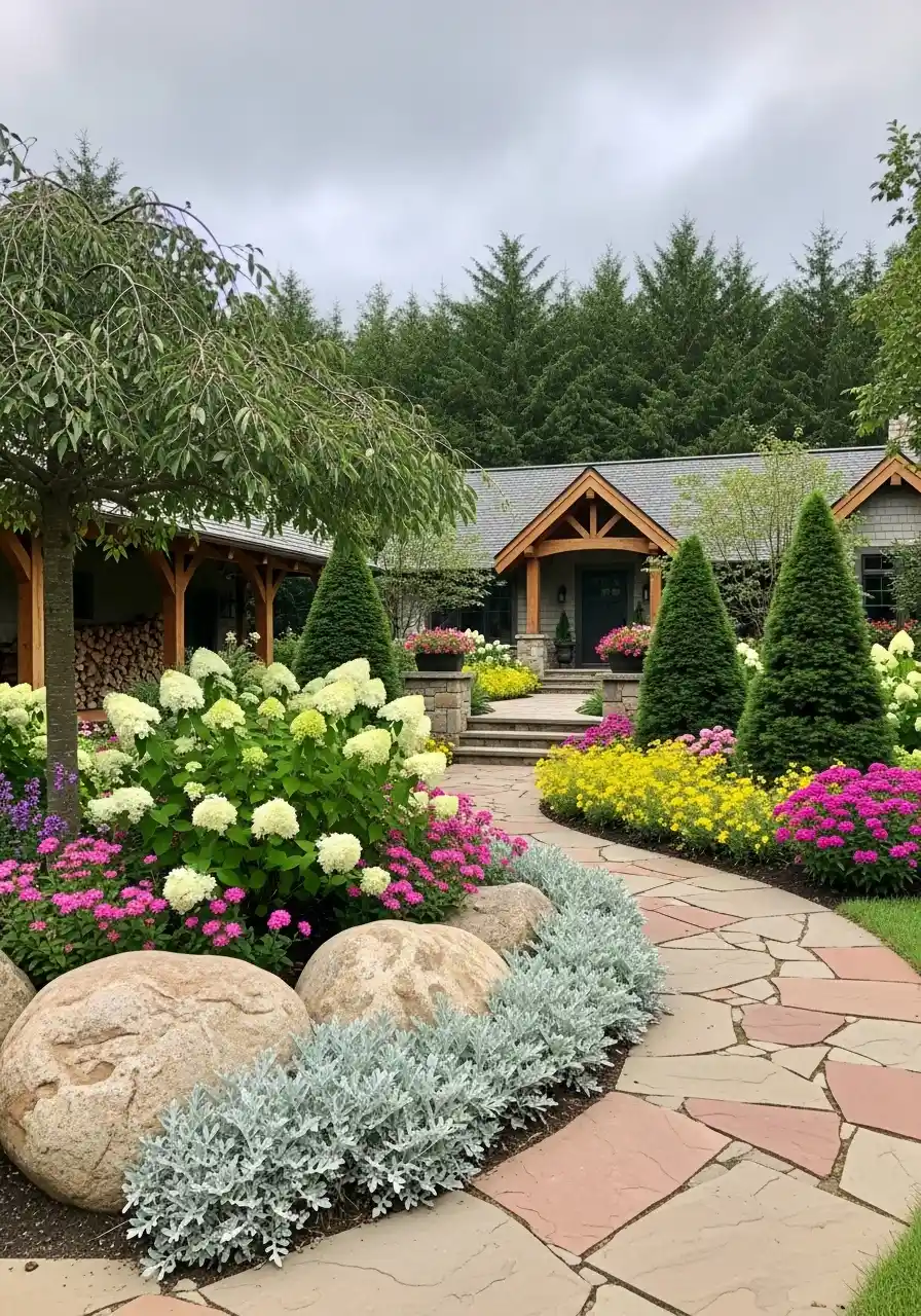 This yard has that dreamy, almost estate-like feeling that makes me stare longer than I planned too. The wide curved stone path leading to the house is beautiful on its own, but the planting makes it feel rich. Big white hydrangeas, bright pink flowers, yellow drifts, tall conical evergreens, and silver edging all work together without becoming chaos. That surprises me because it uses a lot of color. Somehow it still feels organized.