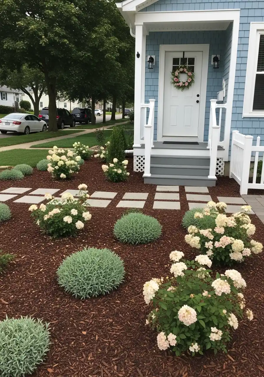 For people searching best Illinois front yard landscaping ideas for smaller homes, this is a very smart layout. It doesnt rely on huge beds or giant statement plants. It uses spacing, repetition, and contrast. I think that is what makes it feel airy. The mulch gives warmth, the stepping stones add rhythm, and the round mounded plants repeat enough to make the yard feel intentional. I’d probably add one more taller feature near the porch corner, but even as it is, this design is strong. It feels modest and pretty. Not flashy, just nice in a way that real people can actually copy.