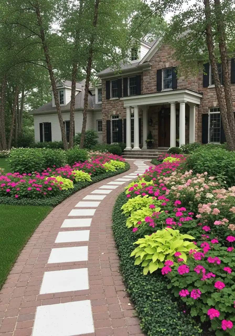This yard feels almost storybook pretty, but in a controlled way. The brick path with square white stepping inserts is such a smart detail. It adds pattern without becoming too much. On both sides, the bright pink flowers and lime green hostas make the walk feel lively. The whole design pulls you toward the porch, but it also makes you want to slow down and actually notice the planting. I like that. Some front yards are nice from the street but boring up close. This one wouldnt be.
