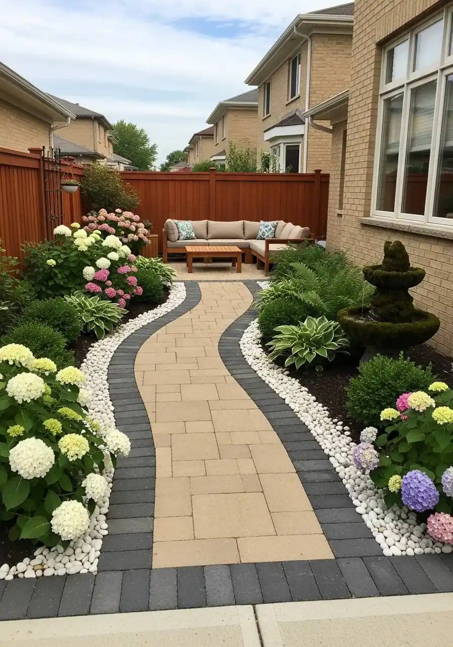 This last image is technically tighter and more enclosed, but I still think the idea is worth stealing. Maybe especially worth stealing, honestly. The winding paver path turns a narrow side space into something useful and charming, almost like a hidden garden room. The black and tan pavers keep the walk crisp, while the white rock edges brighten it up. Add hydrangeas, hostas, clipped shrubs, and a small water feature, and suddenly a forgotten strip of land becomes one of the nicest parts of the property.