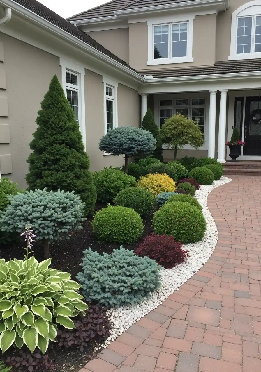 For anyone searching front yard landscaping ideas in Illinois, this layout makes sense because it can handle changing weather without looking messy every other week. I also like how the plant shapes vary. You’ve got upright evergreens, rounded shrubs, fluffy grasses, and flowering plants lower to the ground. That mix matters more than people think. If everything is the same shape, the bed gets boring fast. This one feels balanced. Maybe a little formal, sure, but in a good way. It gives off calm energy.