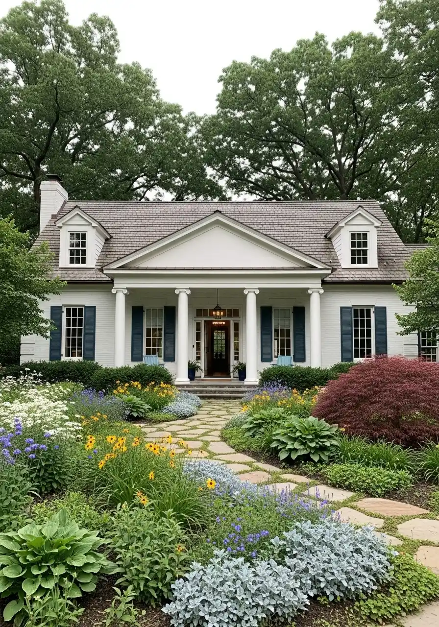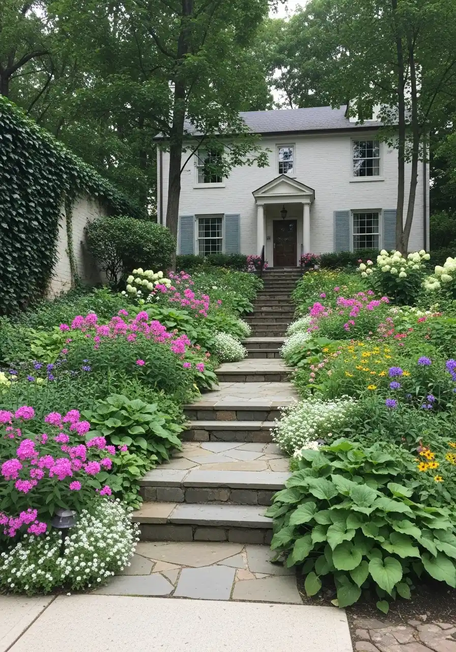 When I think of landscaping ideas for Illinois front yards, this is the kind of design that suits a lot of homes. It handles four seasons visually because the shrubs and structure still matter even when flowers fade. I also like the mix of textures here. There are broad hosta leaves, airy flowers, mounded plants, and silvery foliage near the path. That variety keeps the yard from feeling flat. I’d call this one welcoming more than dramatic. It feels like the kind of house people actually want to walk up to.