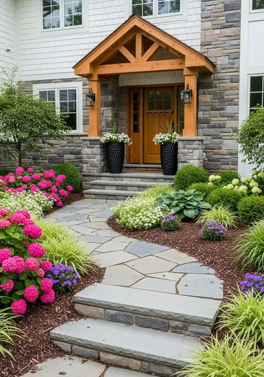 This entrance has a strong focal point, and that timber porch cover really changes everything. The landscaping supports it instead of competing with it. I noticed the curved stone walk first, then the bright hydrangeas, then those container planters at the steps. Every part leads your eye toward the front door. That’s smart design, and I think a lot of people miss how important that is.