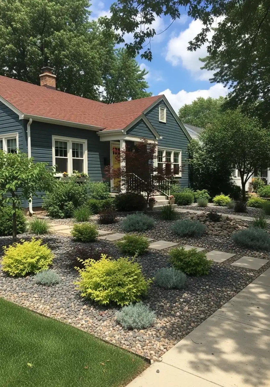 I think this is one of the smartest front yard ideas for Illinois homes when someone wants less mowing and less watering. The deep blue siding and reddish roof already have strong color, so the softer gray stones and green shrubs are a good match. I’d probably add one or two more flowering pockets if I copied this, just to soften it a bit, but the bones are strong. It feels relaxed and practical. There’s also something nice about hearing gravel crunch underfoot. That tiny detail gives the entry more character than people expect.