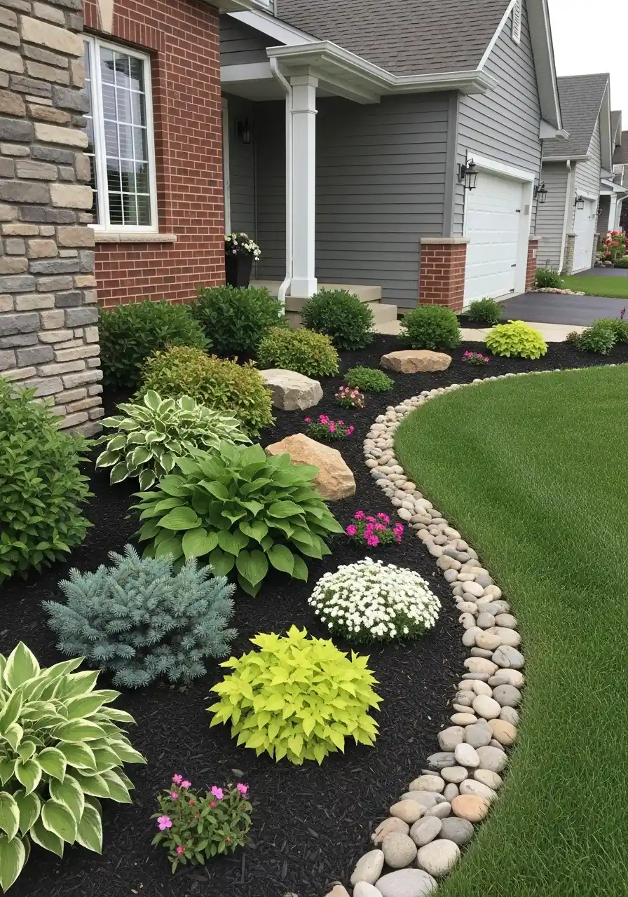 This design feels very usable, which I mean in the best way. It is not trying too hard, and because of that it feels believable. The curved border softens the edge of the lawn, while the river rock creates a clean separation. The mix of hostas, compact evergreens, flowering annuals, and a few boulders makes the bed feel layered without turning busy. I could see this working in so many neighborhoods.
