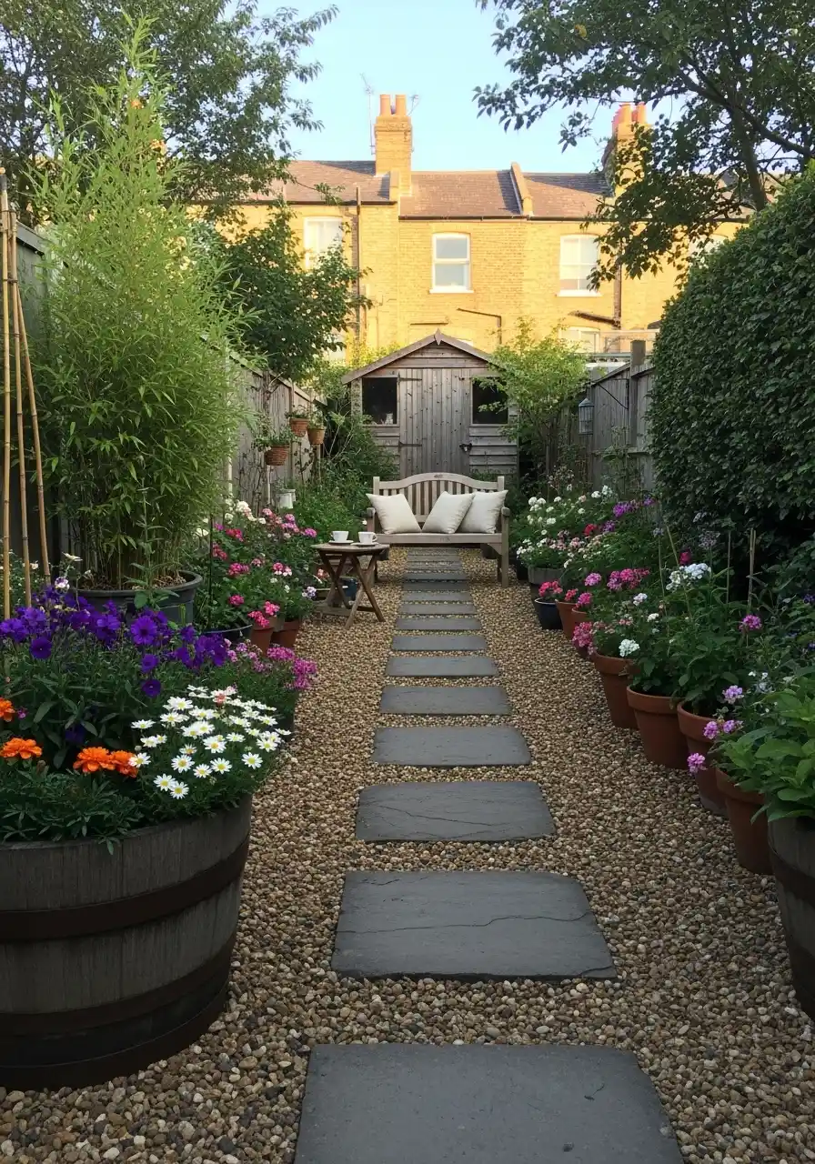 The next image shows a slim garden path leading to a bench and little shed, and I adore it. It proves a narrow space can still have soul. The gravel ground keeps it simple, the stepping stones add order, and the containers full of flowers make the space feel cared for. I also like the bench at the end. It gives the whole path a purpose, which makes the area feel bigger than it is.