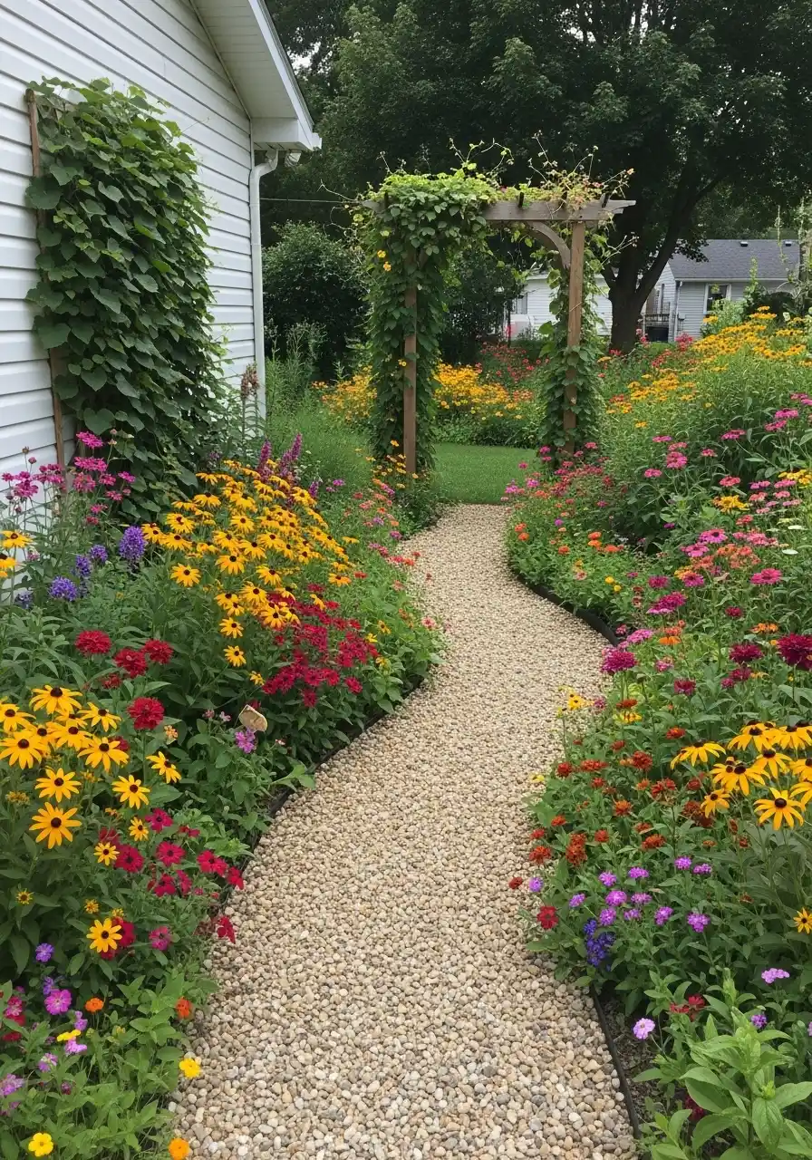 This next new garden caught me right away because the path is doing more than moving you from one spot to another. It is creating suspense. The pale gravel curves softly between thick flowers, then passes under that wooden arbor covered in vines, and it makes me want to keep walking just to see what is next. I really like that feeling. Good indiana native plants landscaping should feel alive, not flat, and this one definitely does. The yellow black-eyed Susans, pink blooms, and scattered purple flowers make the whole space feel cheerful without getting too loud.
