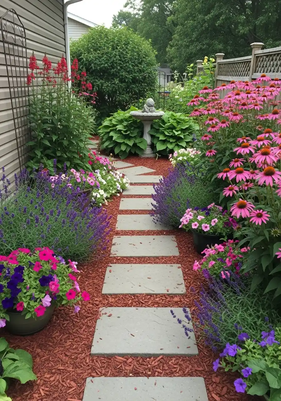 The next image feels a little more tucked away, almost like a secret side garden. I honestly love spaces like this because side yards so often get ignored or treated like storage. This one does the opposite. The square stepping stones are simple, but they bring rhythm. The red mulch gives warmth, and all those pink, purple, and white flowers soften the hard edges of the house. That little birdbath at the end is such a nice touch too. It makes the whole path feel like it leads to something gentle and worth pausing at.