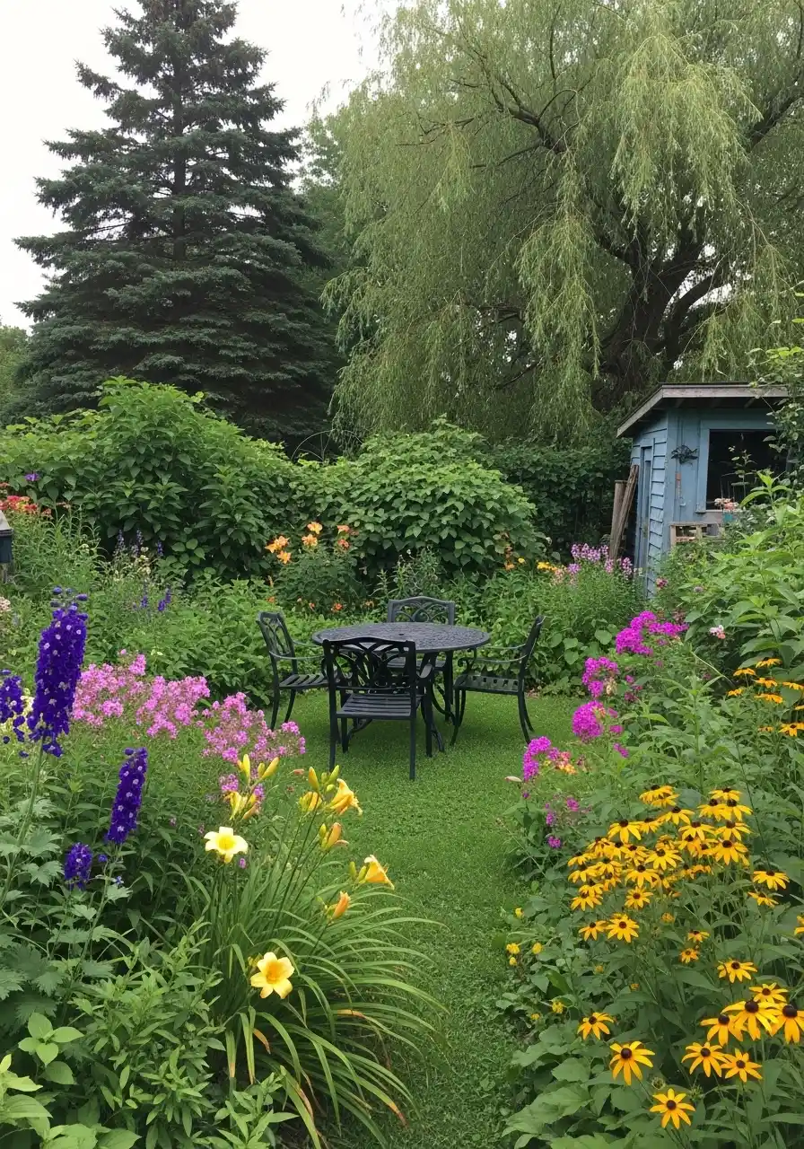 As part of indiana native plants landscaping ideas, this works because it balances wildness and space. Native flowers can spill and bloom and attract pollinators, but the lawn opening in the middle keeps the whole scene from feeling crowded. I think that is what makes it breathe. The taller shrubs and trees around the edge also help the seating area feel sheltered, which I always like. A garden should not just be pretty from a window. It should invite you in. This one does. It feels human, a little imperfect, and really welcoming.
