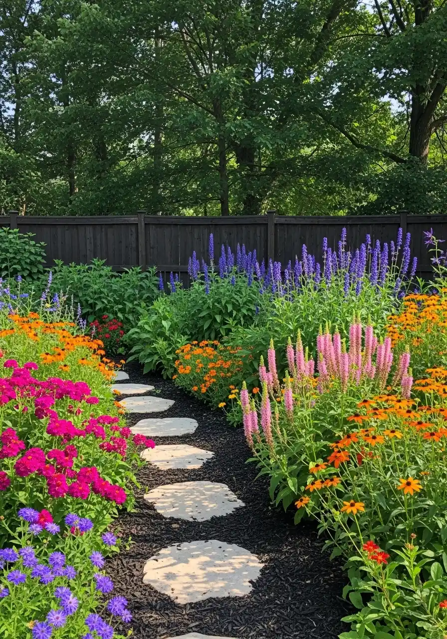 The last image feels the most colorful and theatrical, and I mean that as a compliment. Bright pinks, oranges, purples, and soft rosy spikes all gather around a curved stepping stone path, and the black mulch behind them makes every color look even stronger. This is not a shy garden at all. But what saves it, and keeps it from becoming a mess, is repetition. The path curves cleanly. The flowers are planted in noticeable drifts. The taller purple spires at the back anchor everything and stop the whole bed from feeling flat.