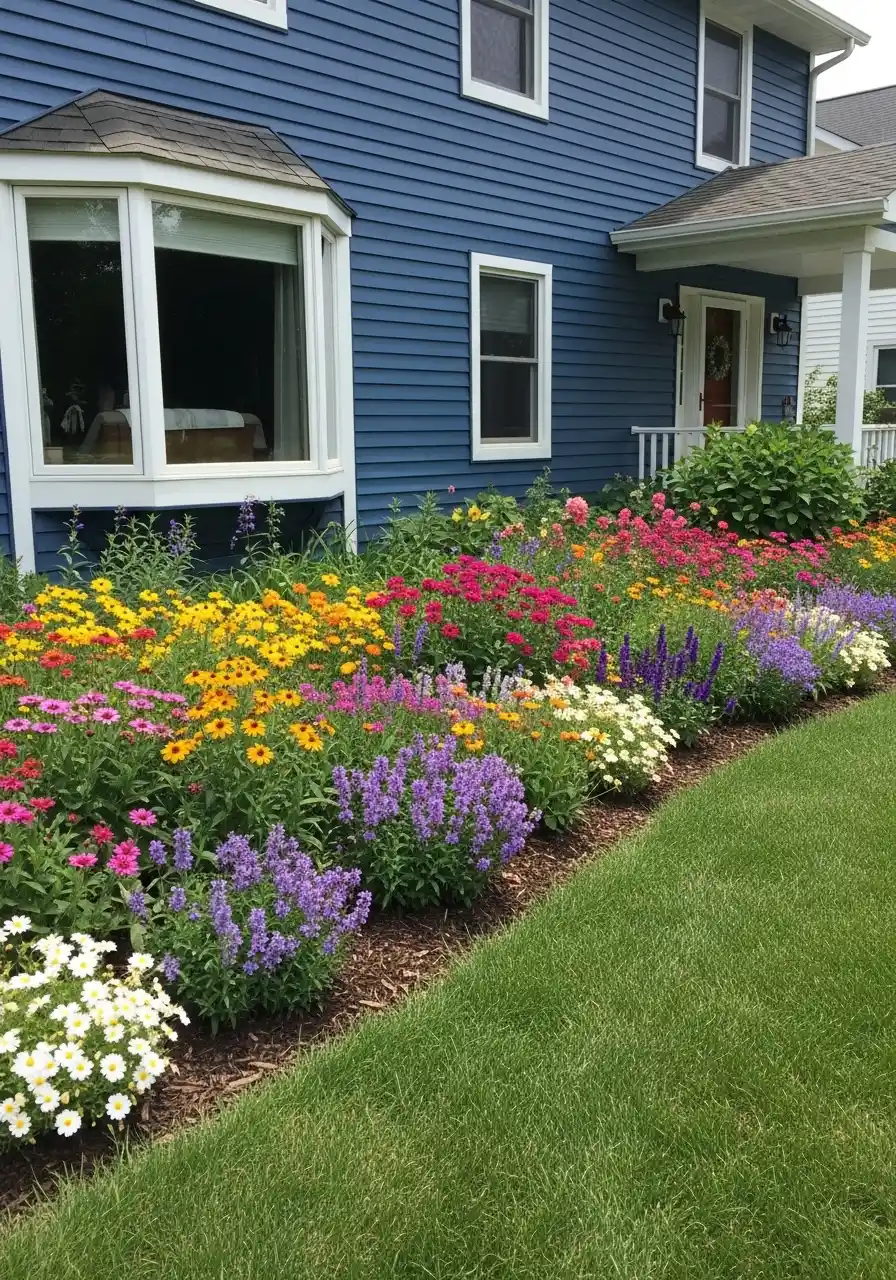The third image is such a good reminder that color can do heavy lifting. The blue house is already pretty, but that long flower border makes it feel joyful. I mean really joyful. Yellow, pink, purple, white, and red are all packed in there, and somehow it still works. I think the reason is the bed itself is simple. It runs in one clean line, so the flowers get to be the stars.
