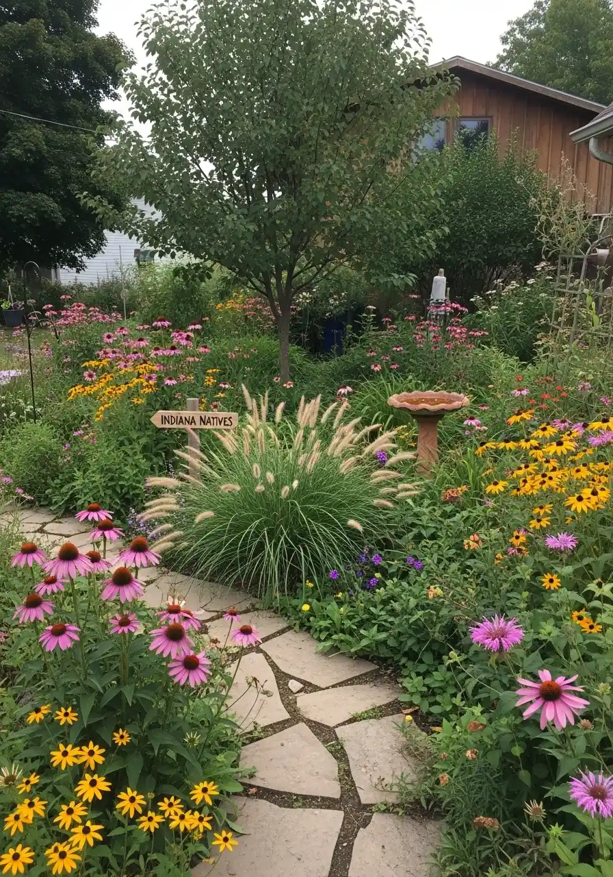 This is one of those Indiana native plant garden ideas that works because it combines structure and wildlife value. The path is clearly defined, so even though the flowers are full and informal, the yard still feels neat enough for a neighborhood setting. I’d use native coneflowers, liatris, bee balm, and low edging flowers to recreate this kind of look. Also, I would absolutely keep a little seating spot in the distance like this yard has. It gives the eye somewhere to rest. Small thing, big effect.