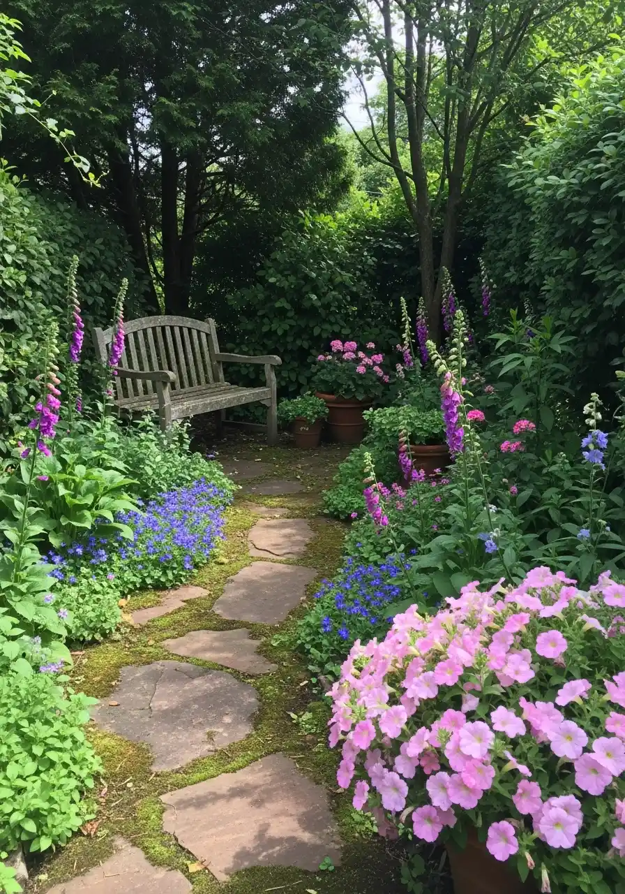 The fifth image is quieter, and I needed that. After all the brighter gardens, this little shaded path leading to a weathered bench feels almost secretive. The soft pink blooms, blue flowers, foxglove spires, and mossy stones give it a cool, tucked-away mood. I like gardens like this because they feel private. They slow me down. They make me think a yard doesn’t need to be loud to be memorable.