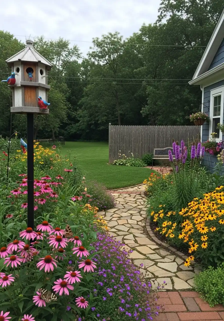 This image is just happy. That’s the word that keeps coming to me. The curved stone path, the birdhouse, the pink coneflowers, the yellow blooms, the purple flowers by the edge, all of it feels bright without feeling fake. I especially love that birdhouse pole. Some people would skip it because it is “extra,” but I think it gives the garden personality. A yard that welcomes birds usually feels warmer somehow.