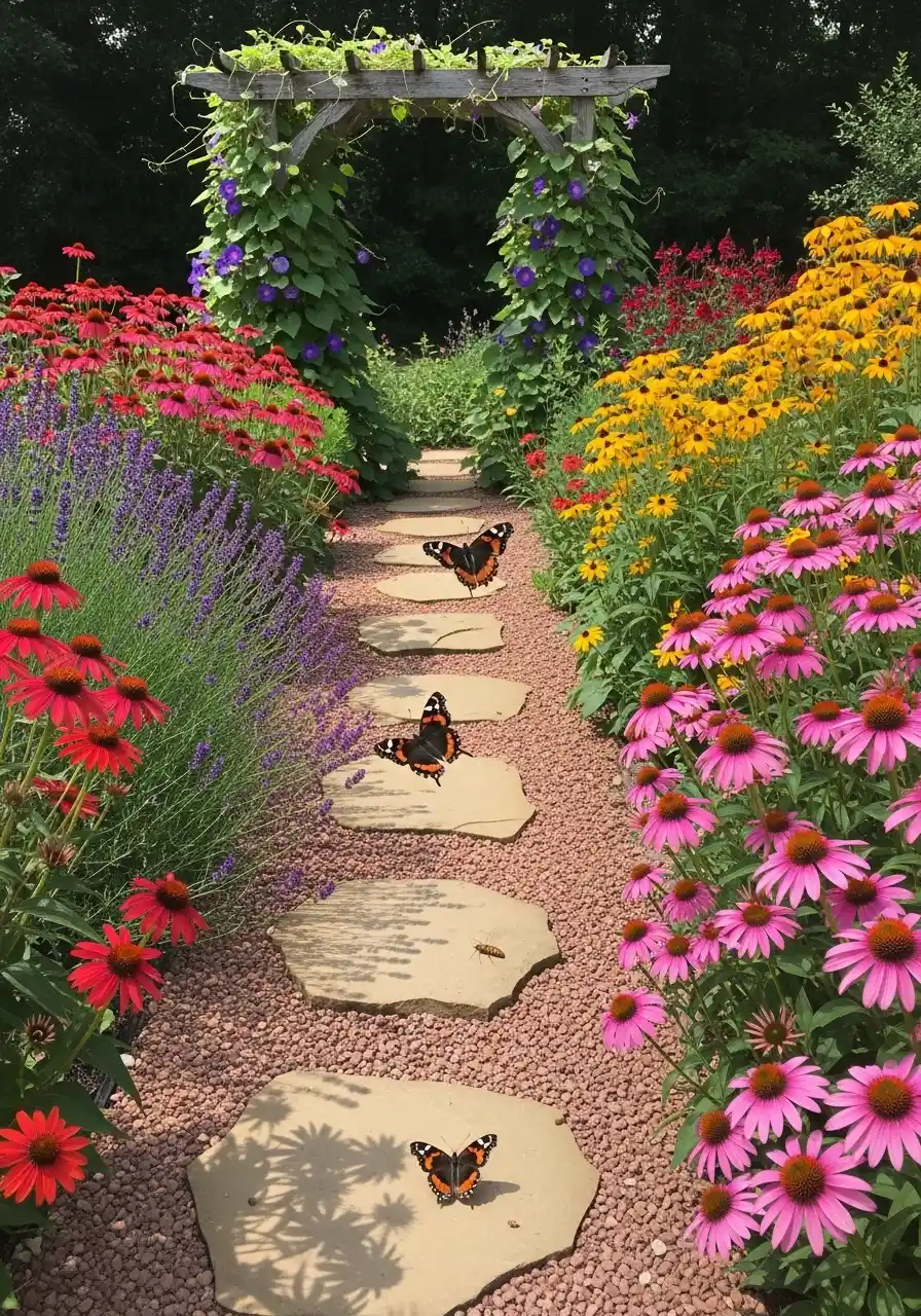 I know “magical” sounds dramatic, but this garden really does have that vibe. The path of stepping stones through small gravel, the vine-covered arbor, and the thick waves of pink, red, yellow, and purple flowers feel straight out of a summer daydream. And the butterflies are not just cute. They prove the design is doing what it should. The flowers are feeding life, not just sitting there being decorative.