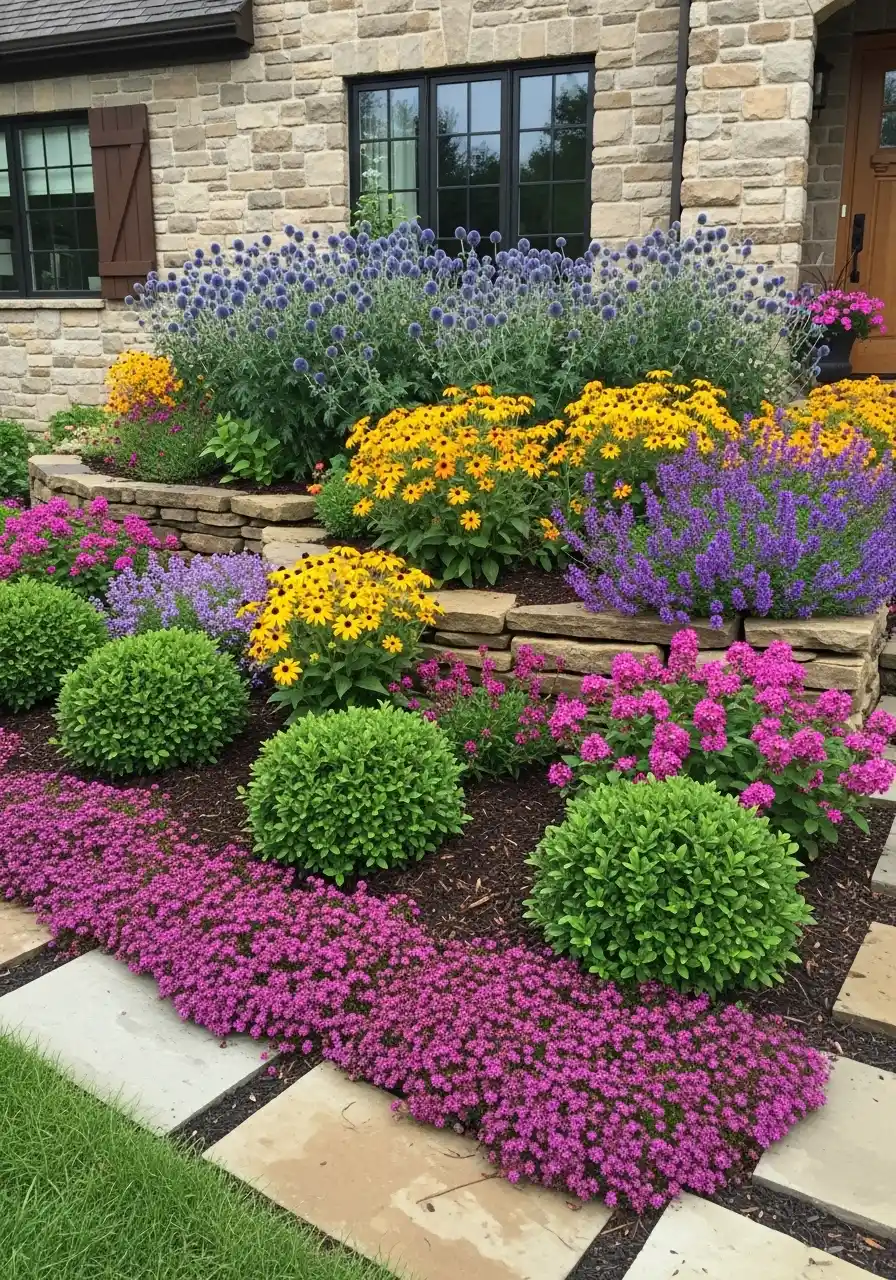 This stone-front house already looks strong, but the planting takes it way further. The tiered retaining walls help the flowers read in layers, and that makes the whole bed look full and expensive. Purple globe-like blooms at the back, yellow flowers in the middle, pink masses near the front, clipped green shrubs, all of it is arranged in a way that feels intentional. I really admire that, because native inspired gardens can sometimes lose visual order if the bones are weak.