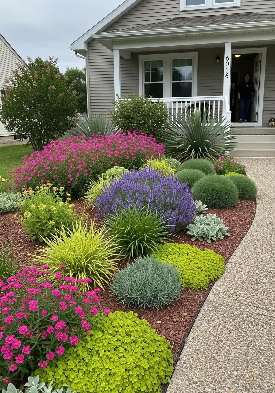This yard is probably the most suburban-friendly of the bunch, and I mean that as praise. The mulch bed curves cleanly along the walk, the plant groups repeat, and the colors are bright but controlled. Pink blooms, purple spikes, lime green mounds, blue-gray texture plants, and rounded evergreen forms all play together really nicely. It feels cheerful, but still easy to read from the street.
