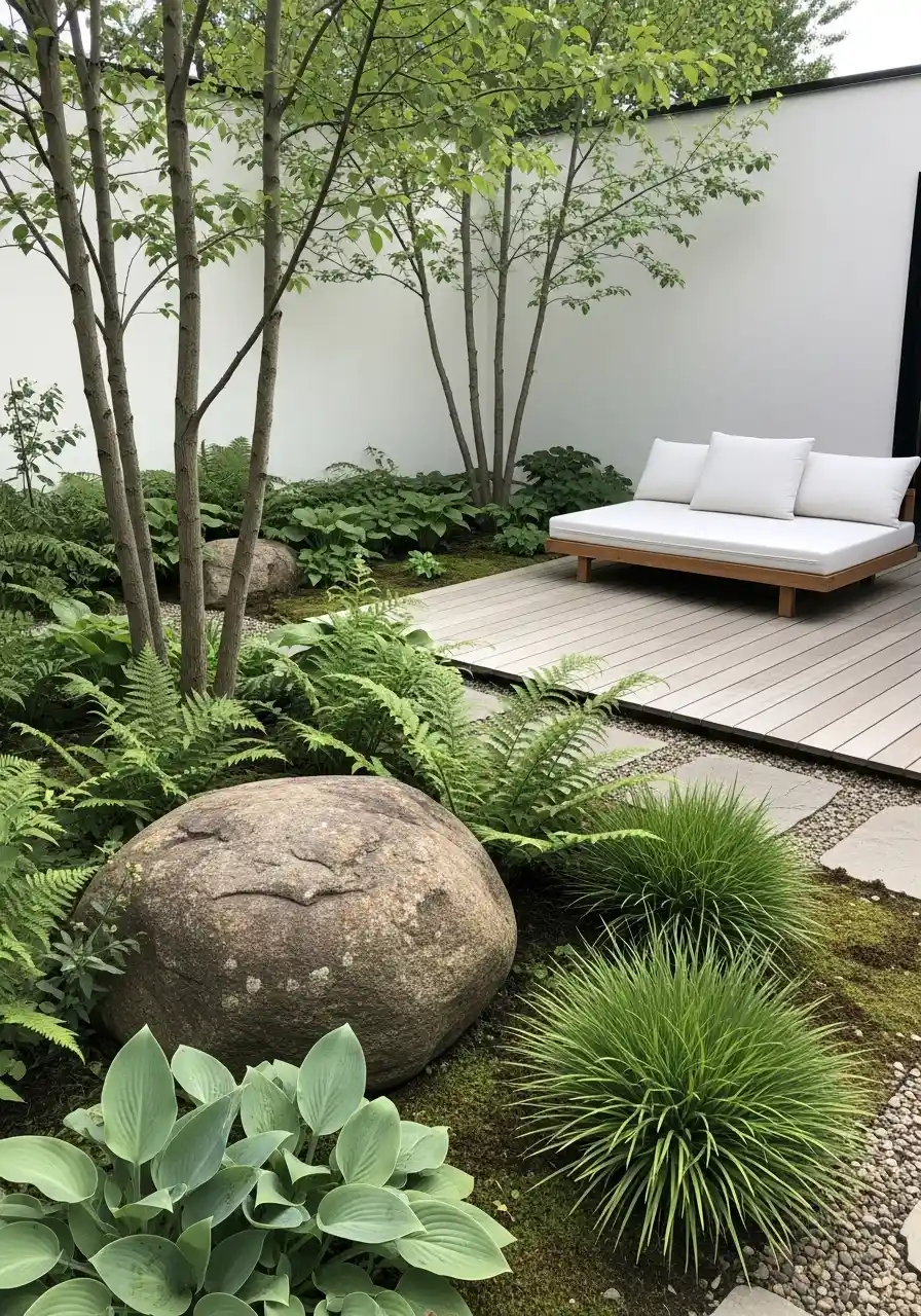 The tenth image is the calmest one here. There is a simple daybed on a wood platform, slim trees, boulders, ferns, hostas, and low grasses arranged around a white wall. It feels minimal, but not empty. I really admire that because minimal gardens can go wrong fast if they feel barren or cold. This one does not. It feels soft and breathable. The boulder anchors the whole space, and the layered greens keep it from becoming flat.