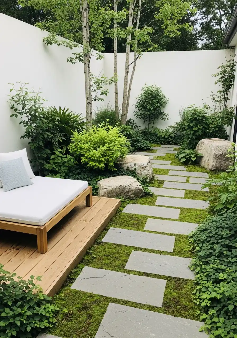 Minimal courtyard with stepping stones and soft green groundcover