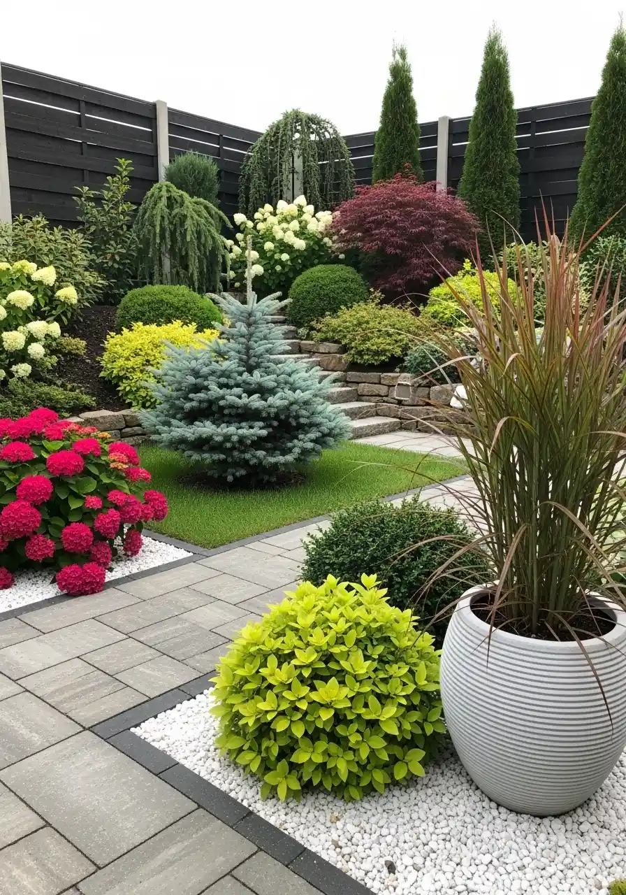Use strong structure first. Evergreens, stone, paths, and shrubs keep the yard looking good even when flowers are gone.