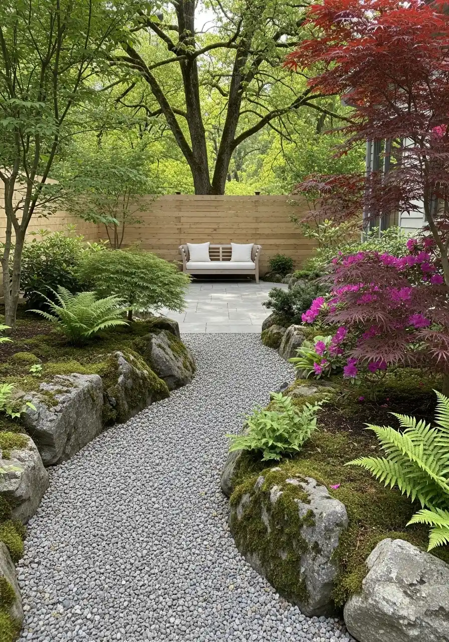 This image is probably the one that feels most like a retreat. The gravel path moves between large boulders, moss, ferns, and layered trees before reaching that little bench in the back. I mean, come on, that is lovely. It feels like the yard is asking you to slow down. I really respond to that kind of design because it feels emotional, not just decorative.