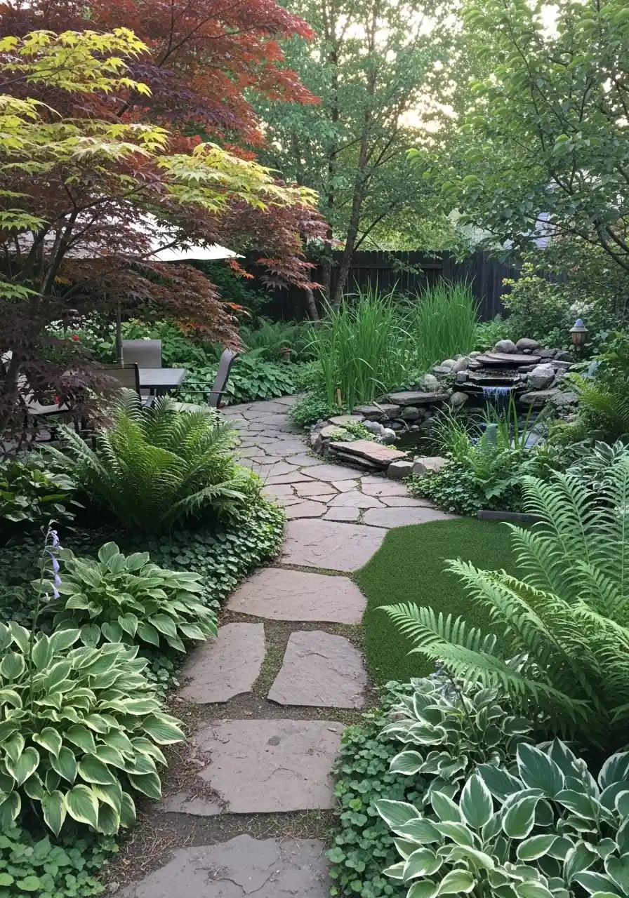 Natural flagstone walk with hostas, ferns, and a small water feature