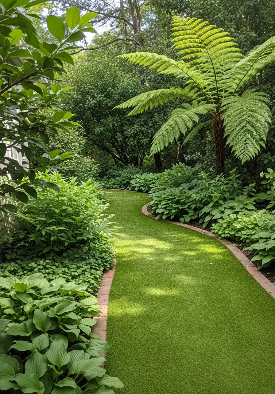 This yard is simple in one sense, but I really think it is genius. The main feature is basically a curving green path with deep planting beds on both sides. But wow, it feels rich. The path pulls you forward, and the dense leaves make the whole space feel enclosed and fresh. That giant fern-like plant gives the whole area a tropical-looking lift, even though the overall feeling is still grounded and natural.