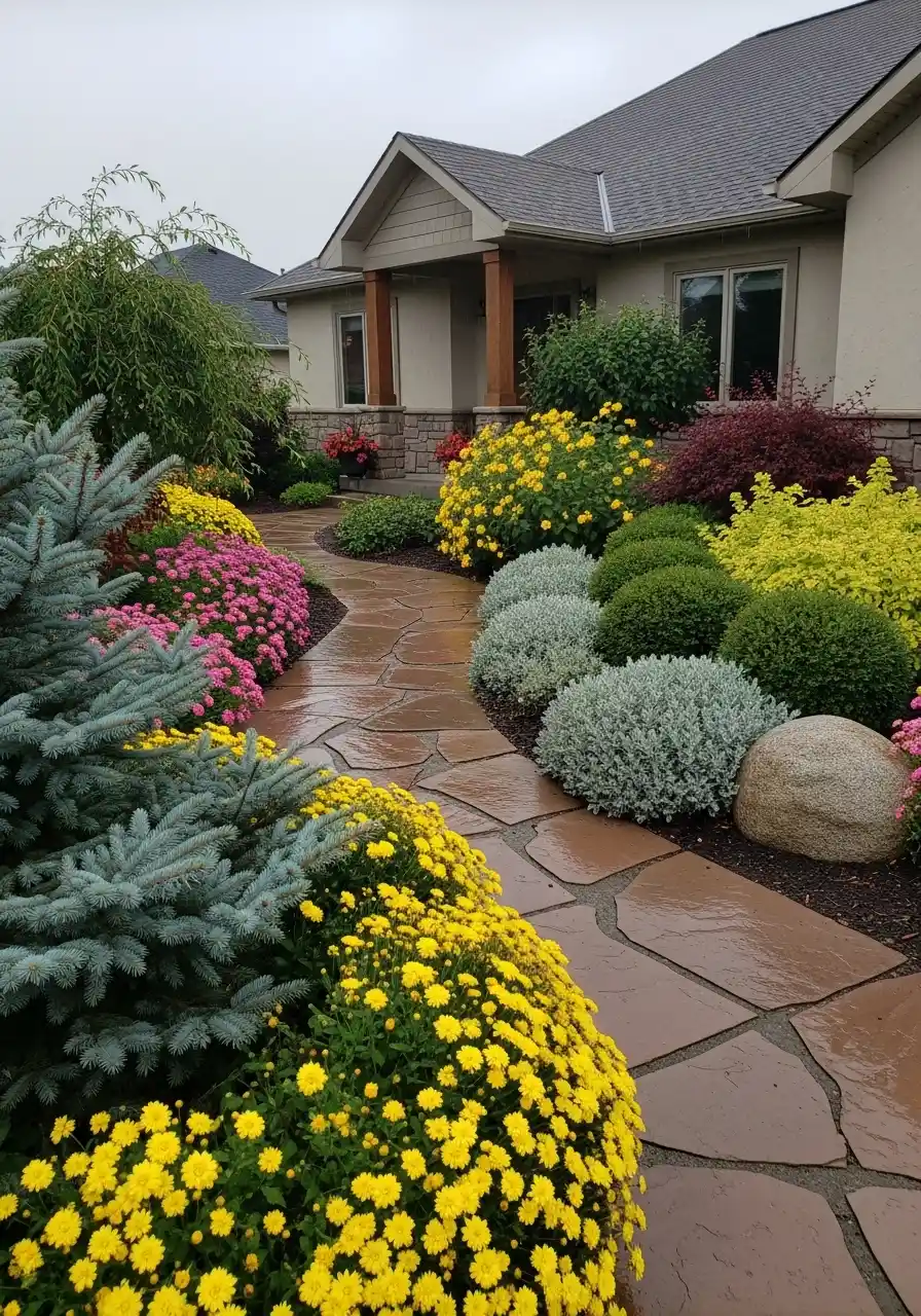 This yard feels the most welcoming to me. The curved stone walk leads right up to the front porch, and the planting on both sides is cheerful without feeling wild. The yellow flowers are bright and happy, the blue spruce adds cool contrast, and those rounded silver shrubs give the whole bed a neat, almost glowing look. I know some people think yellow is too much, but I disagree. Here, it feels warm and alive.