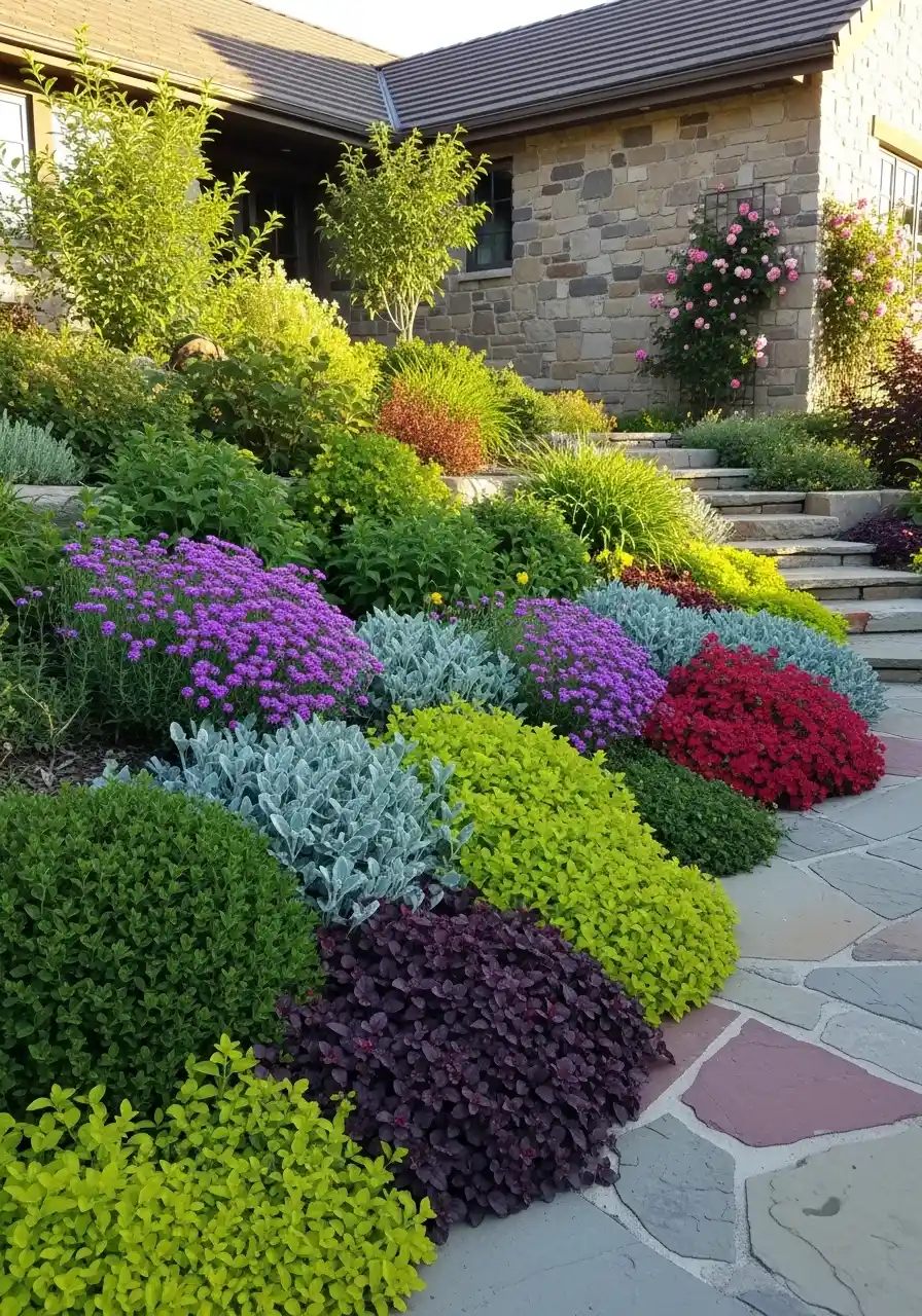 The photo is full of energy, and I kinda love that. The slope is packed with purple, red, lime green, silver, and soft green plants, all layered around stone steps and a stone-faced home. It has a lot going on, but it still works because the shapes are repeated. Rounded shrubs, mounded perennials, and clipped forms keep the color from feeling messy.