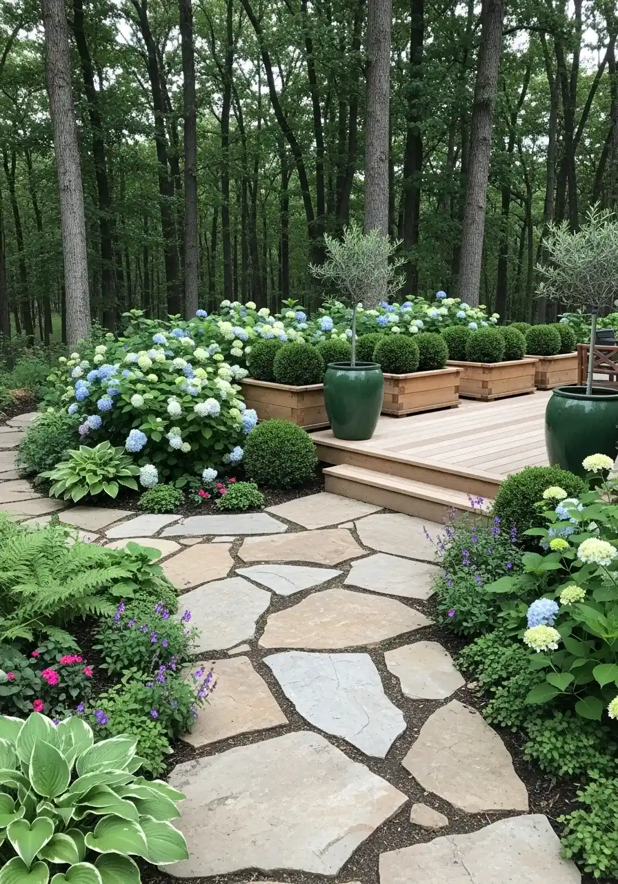 Stone patio and deck with hydrangeas, boxwoods, and woodland backdrop