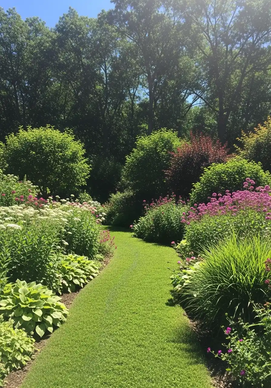 The plant mix is doing a lot here. There are hostas, white blooms, pink globe flowers, grasses, and mounded shrubs all layered together. But it still works because the path is simple and the background trees are dark and calm. For Montana garden landscaping ideas, I think this is a lesson in how to use abundance without turning the whole yard into chaos. Keep the path shape clean, repeat plants, and let the color gather in drifts. It feels lush and emotional, which maybe sounds dramatic, but that is honestly how it reads to me.