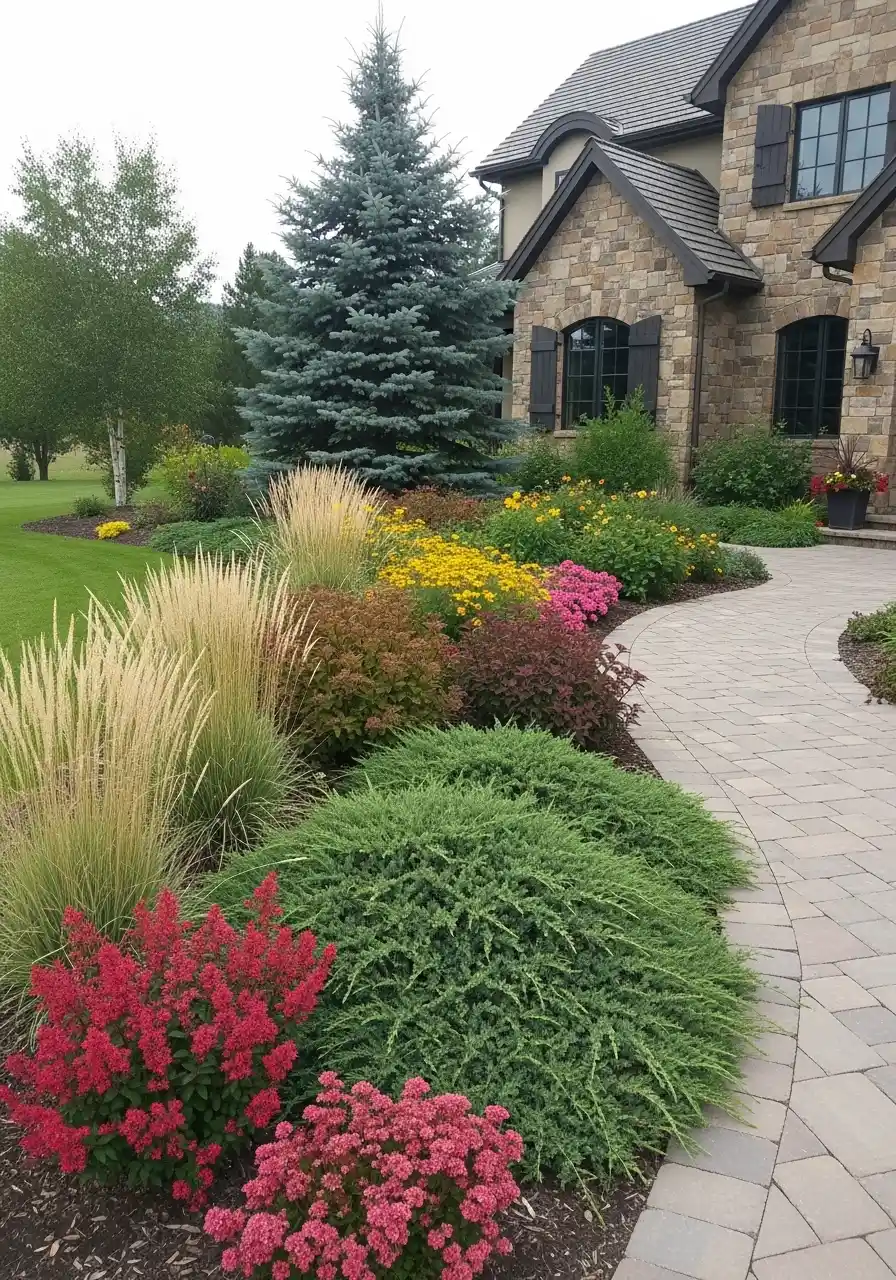 What I like most is the balance of structure and softness. The blue spruce gives height and anchors the whole bed. The grasses add movement. The lower shrubs keep the edge tidy. That mix matters. If it was all flowers, it would feel flimsy. If it was all evergreens, it might feel too stiff. For Montana front yard landscaping ideas, I would absolutely borrow this kind of plant layering. It feels elegant and grounded, and it also looks like it would hold up nicely through more than one season.
