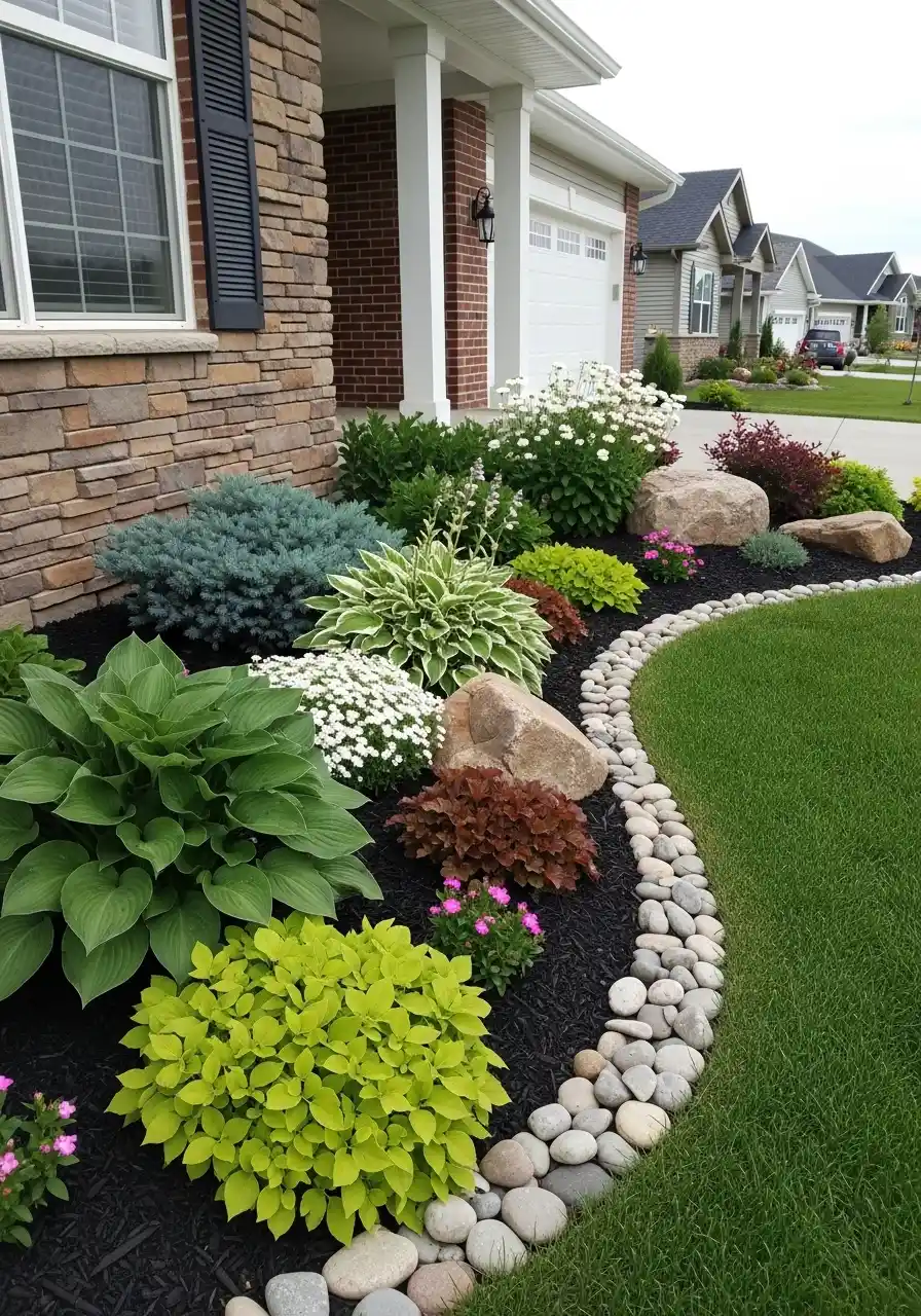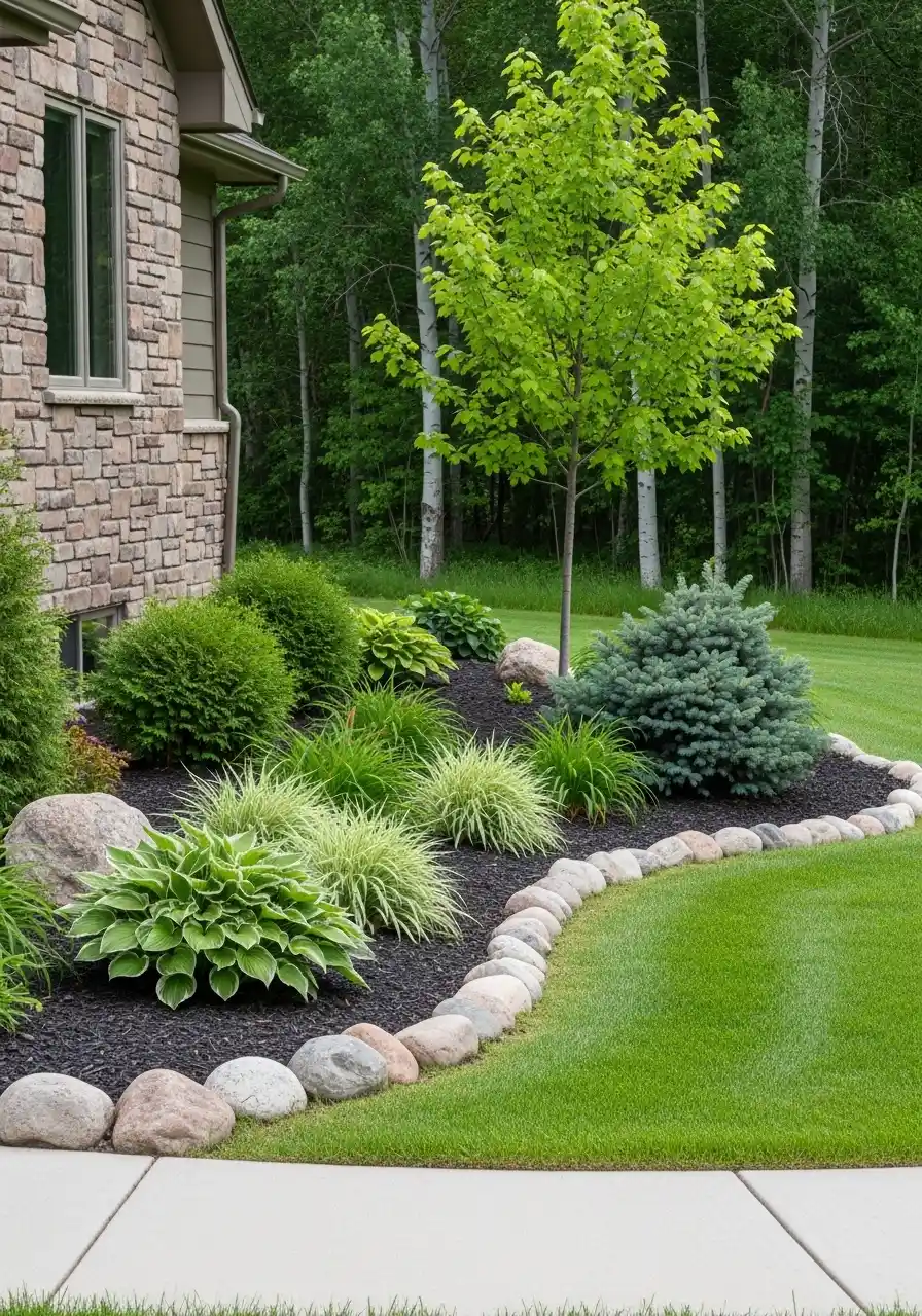 For montana landscaping ideas, this kind of setup is really practical. The rounded stones define the bed edge clearly, the lawn still has room to breathe, and the plants are varied enough to keep it interesting without making it busy. I like the little contrast between the chartreuse grass, blue spruce, and hosta leaves. That cool-toned mix feels fresh. If I had a suburban front yard and wanted good curb appeal without a ton of upkeep, this is one of the Montana landscape ideas for home I would save first.