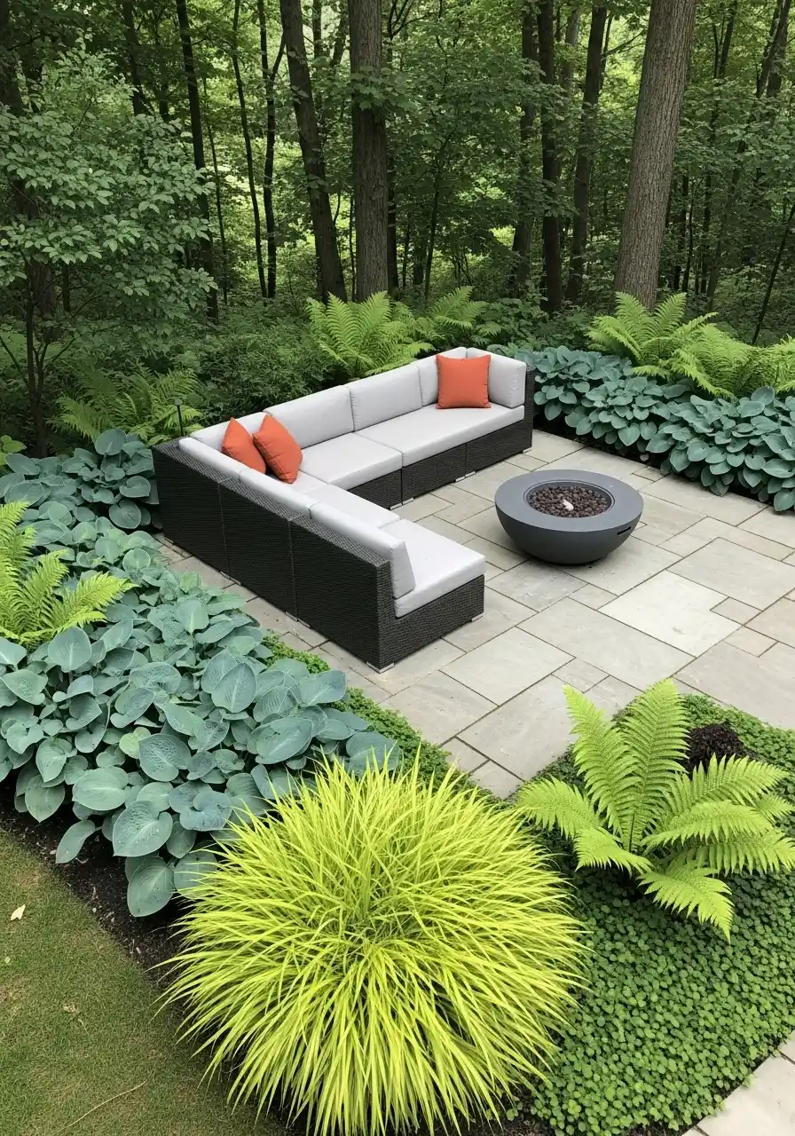 For Montana backyard landscaping, this is a beautiful example of using shade plants well. Instead of fighting the woodland setting, it works with it. That is always smarter. The furniture is clean and modern, but the plants keep the space from feeling hard. I would recommend this kind of layout for anyone with a wooded lot who wants a low-key gathering area. It is one of my favorite landscaping ideas for Montana yards here because it feels so calm and honest. Not flashy, just really good.