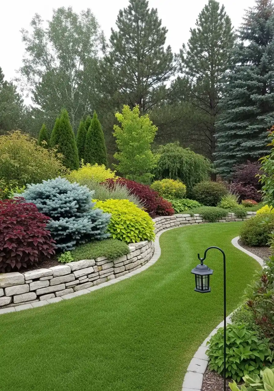 For Montana landscaping ideas, this is a strong move when you have slope or just a lot of open yard that needs shape. The retaining wall gives the planting a stage. The plant colors are also smart. Blue, burgundy, lime, and dark green always look rich together. I would not add too many flowers here because the foliage contrast is already doing so much. This is one of those Montana landscape design ideas that feels polished and expensive, but it is really the bed shape and plant repetition doing the magic, not just the budget.