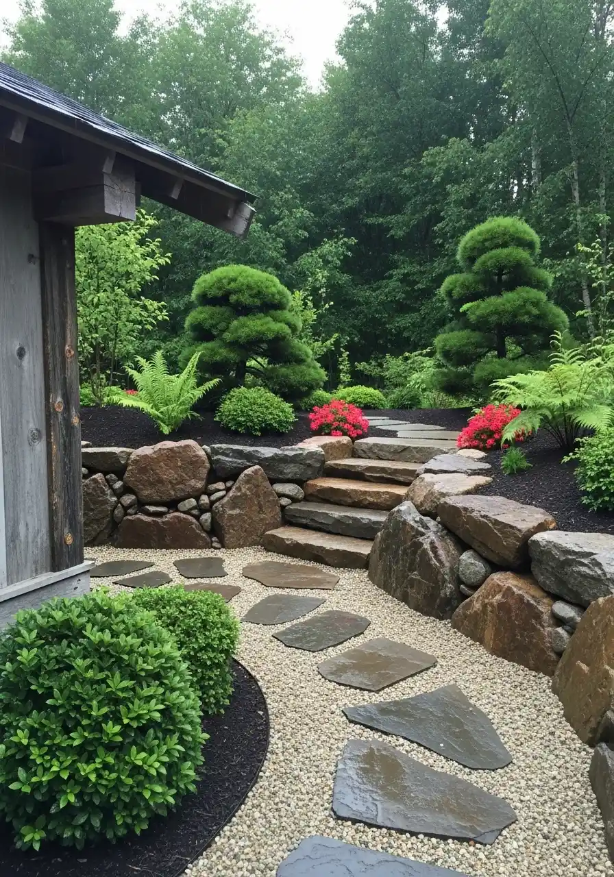 What helps it work is the strong contrast between rough and soft. Heavy rock walls sit next to soft fern fronds and clipped shrubs. Bright pink flowers bring life into an otherwise dark, earthy palette. For Montana garden path ideas and more natural yards, this kind of design is great because it feels rooted to the land. I would use this on a sloped or wooded property where the site already has some ruggedness. It feels thoughtful, moody, and really satisfying to look at from every angle.