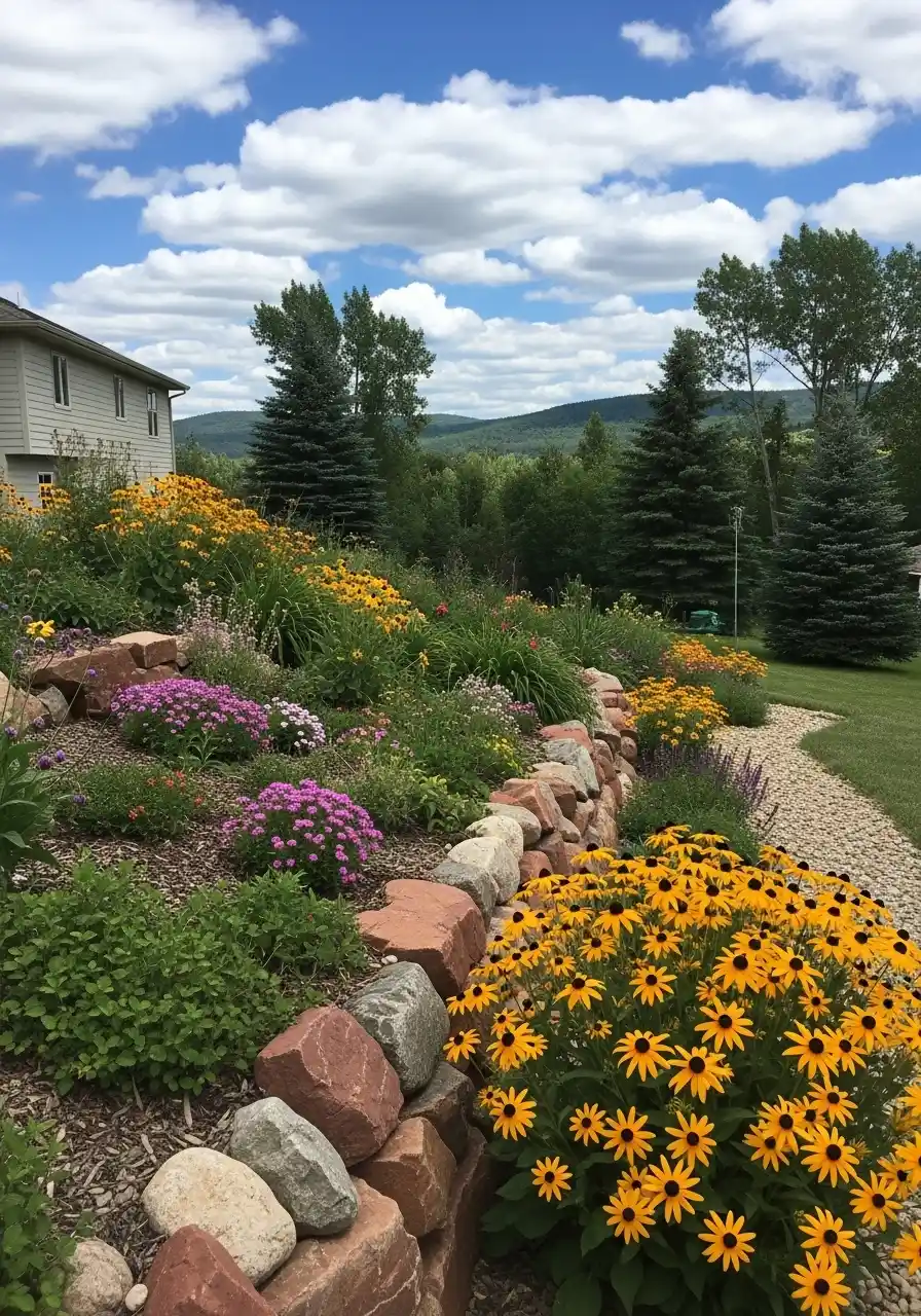 The tenth image is probably the most joyful one to me. Big sweeps of black eyed Susans, pink flowers, layered stone edging, and a winding path along the slope. It feels generous. Like the garden is spilling out in the best way. For larger lots or homes with a view, this is one of the most memorable nebraska landscaping ideas in the set.
