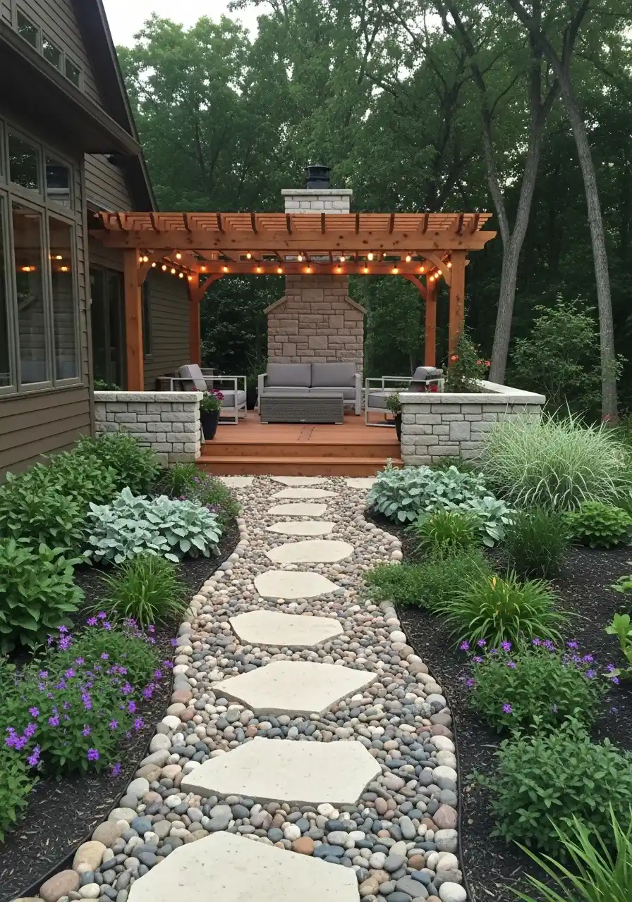 Backyard pergola path with river rock for a cozy gathered feel