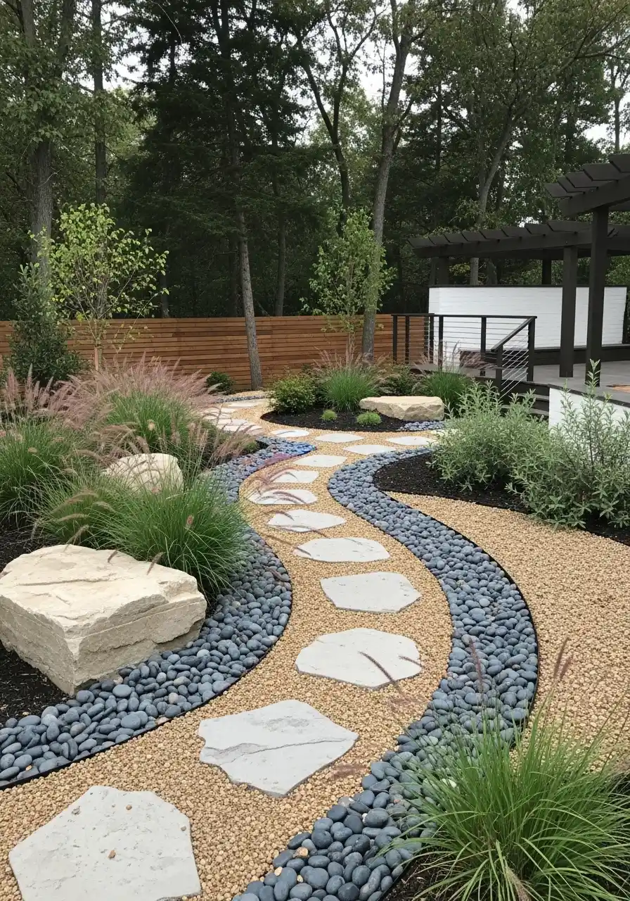 The next image feels more designed in a crisp, modern way, but I actually think it still has warmth. The curving tan gravel path, dark stone ribbons, big pale boulders, and airy grasses give it a clean look without feeling stiff. For people wanting nebraska landscaping ideas that lean contemporary, this one is packed with smart moves. The contrast between the light path and dark pebble edges is what really carries it.