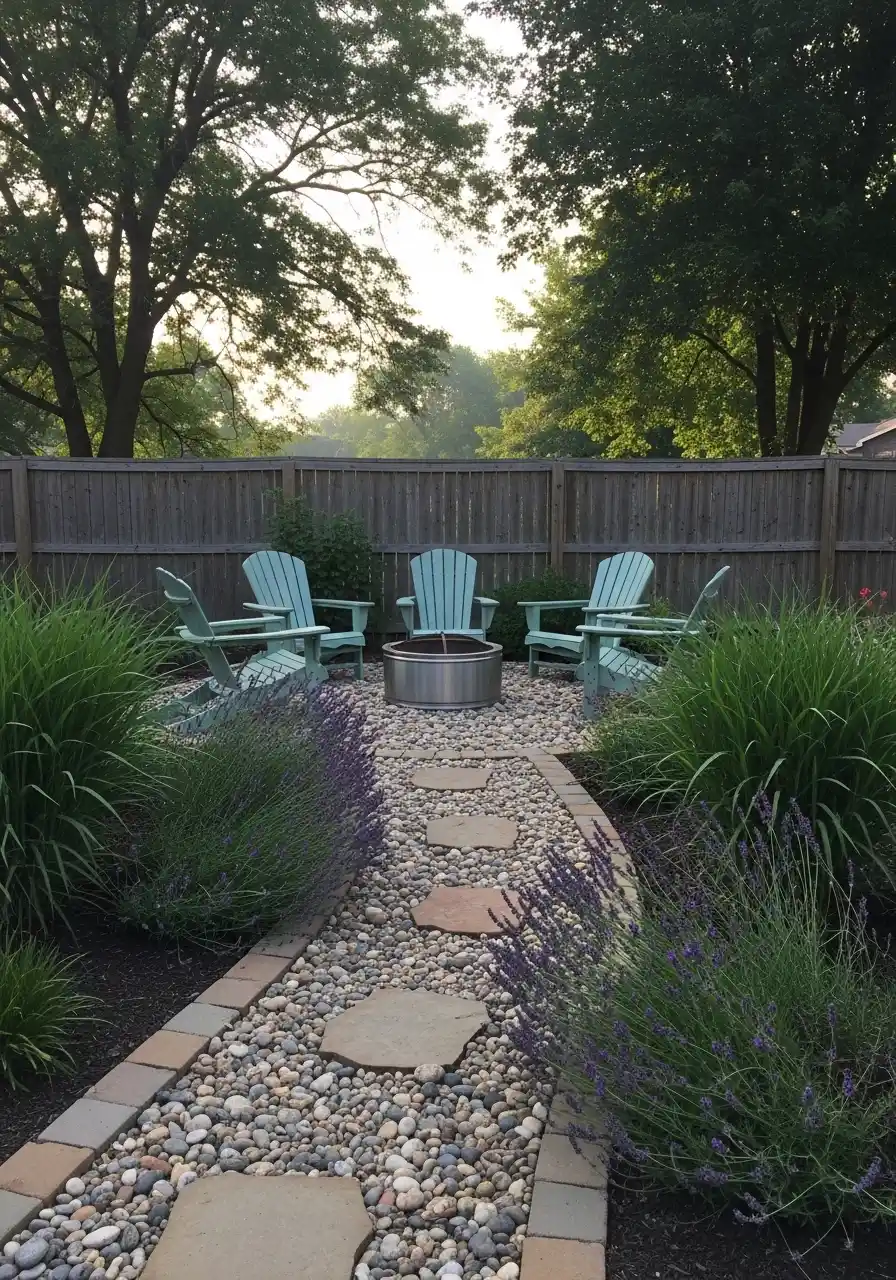 This image has a very different mood, and I think thats why it stands out. It is simple, quiet, and built around people sitting together. The path is narrow and direct, with small stepping stones set in river rock, and it leads to a round fire pit circle with Adirondack chairs. To me, this is one of the most usable nebraska landscaping ideas in the whole set. Not just pretty. Useful.
