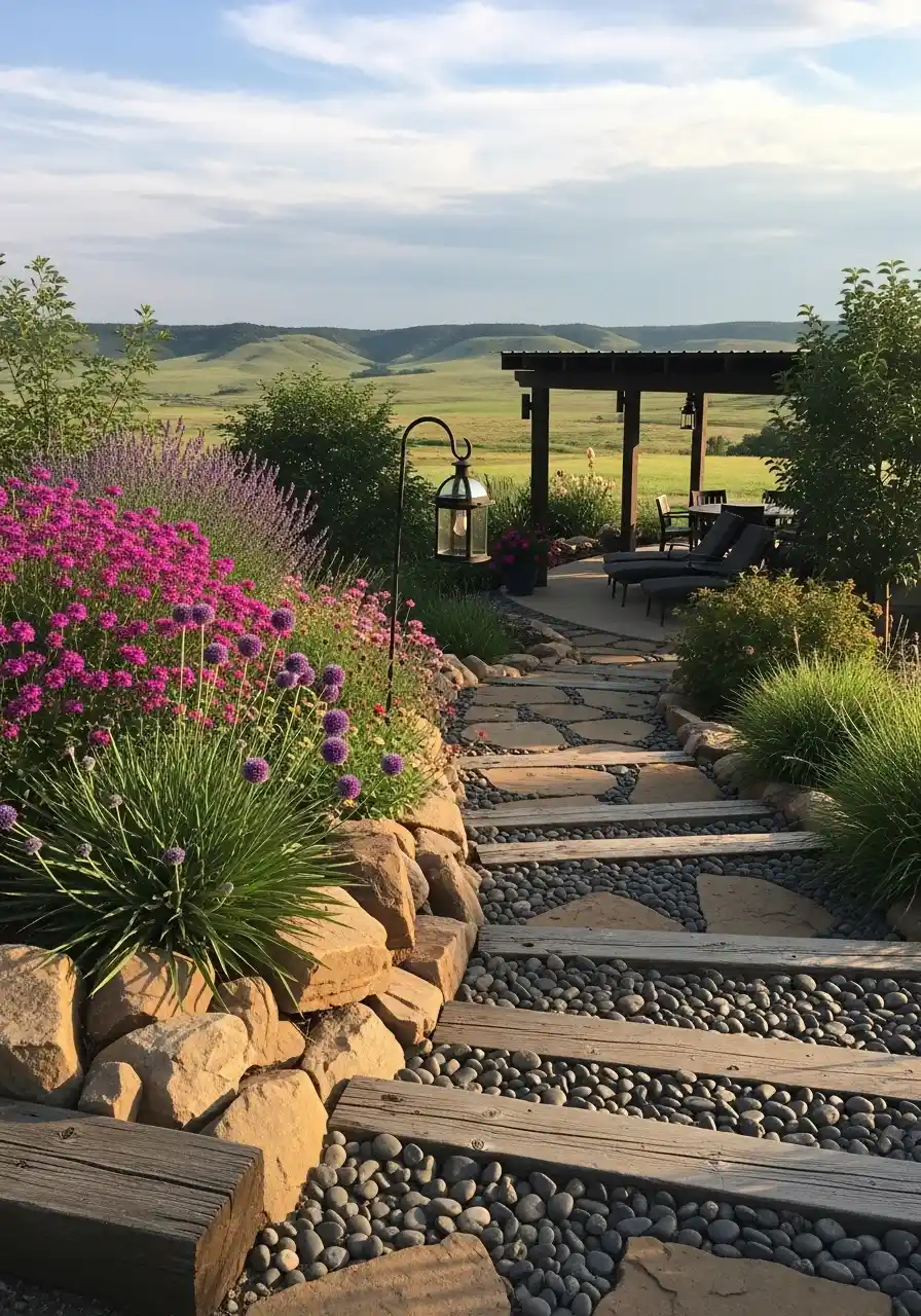 This image is kind of breathtaking, not gonna lie. The view helps a lot, yes, but the landscape itself is still full of great ideas. The path uses timber steps, flat stone, and dark river rock in a layered way that feels rustic but well planned. The flower colors are brighter here too, with pinks, purples, and those globe-shaped blooms making the whole hillside feel joyful. For dramatic nebraska landscaping ideas, this one is full of inspiration.
