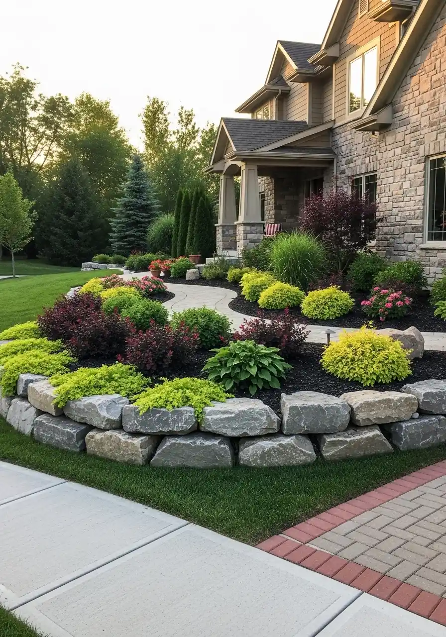 Tiered front foundation beds with bold stone edging
